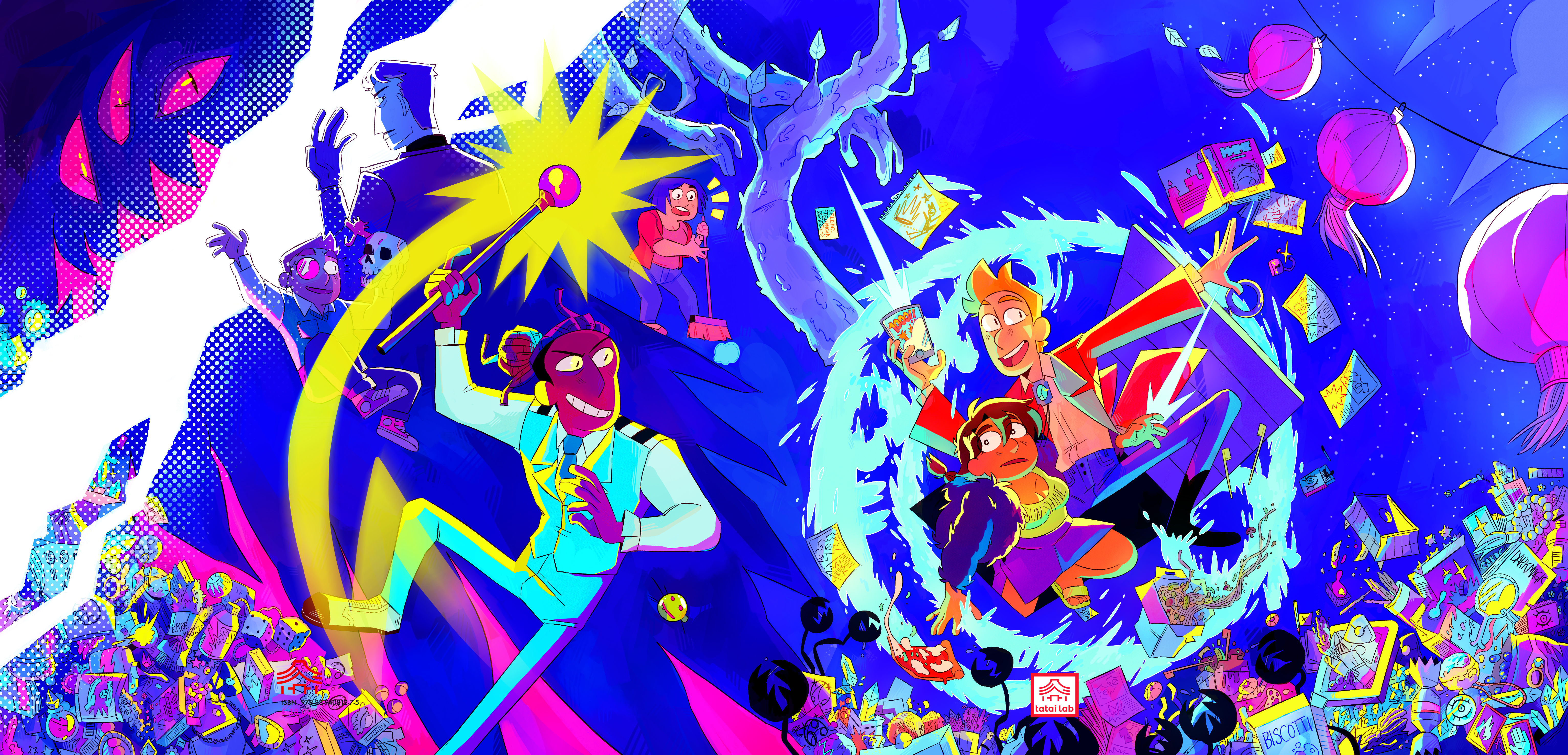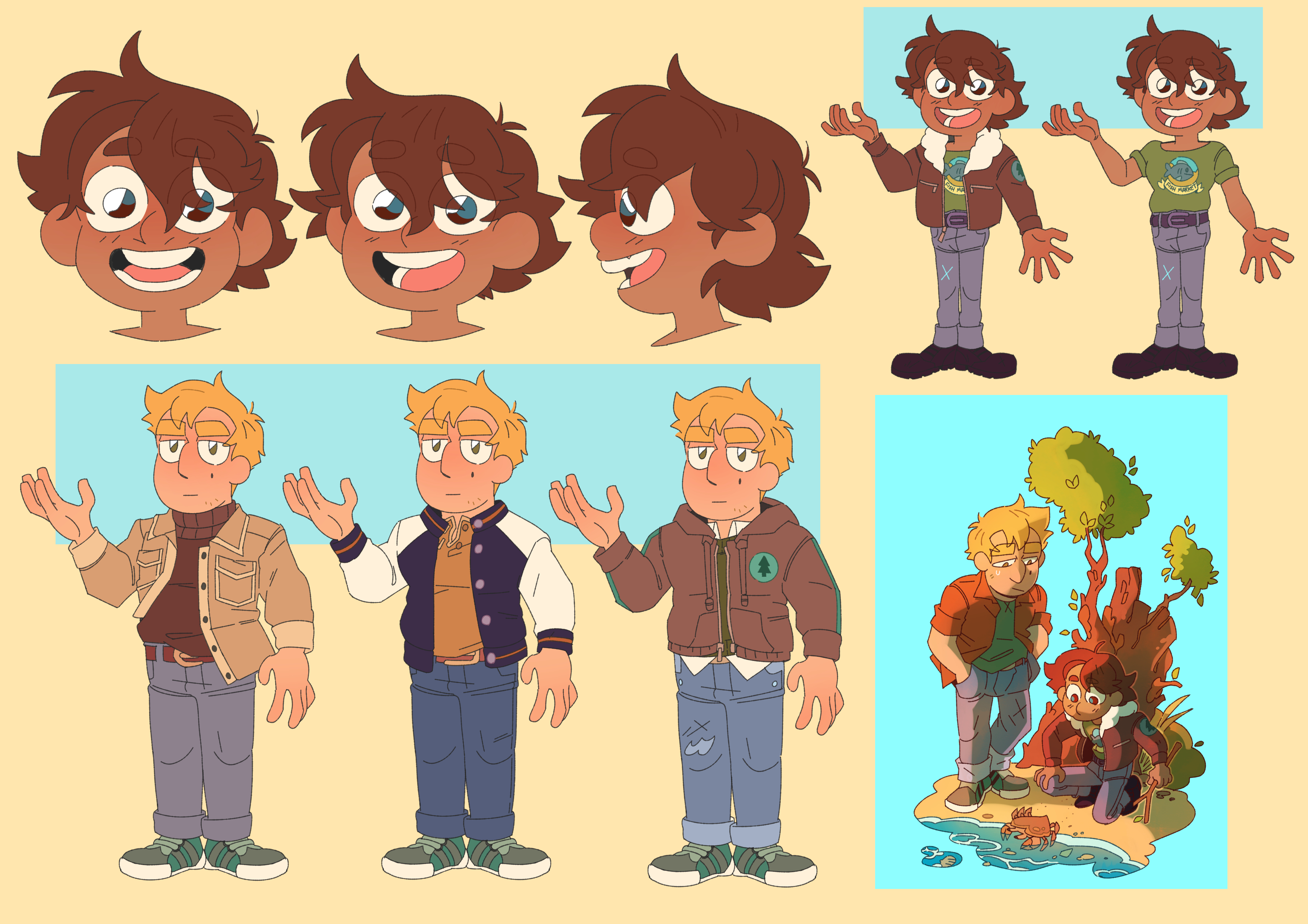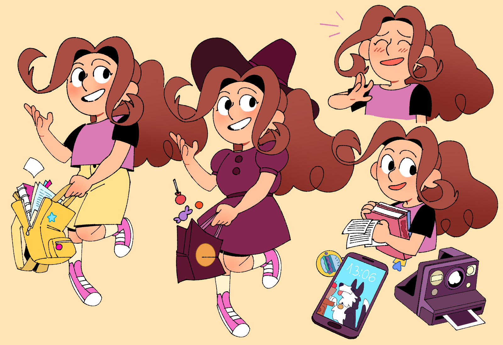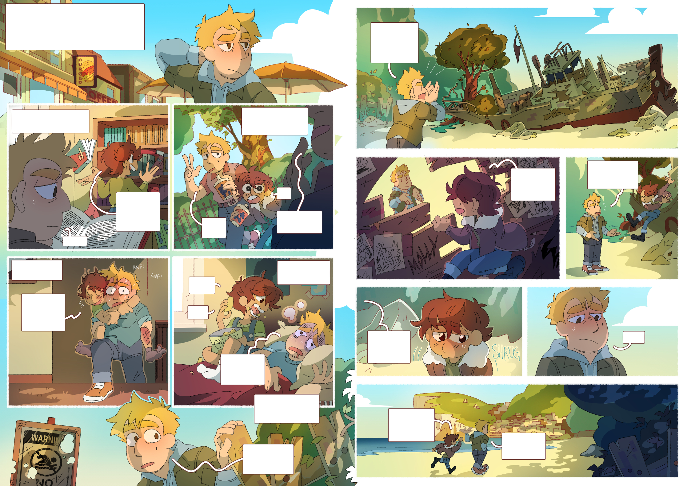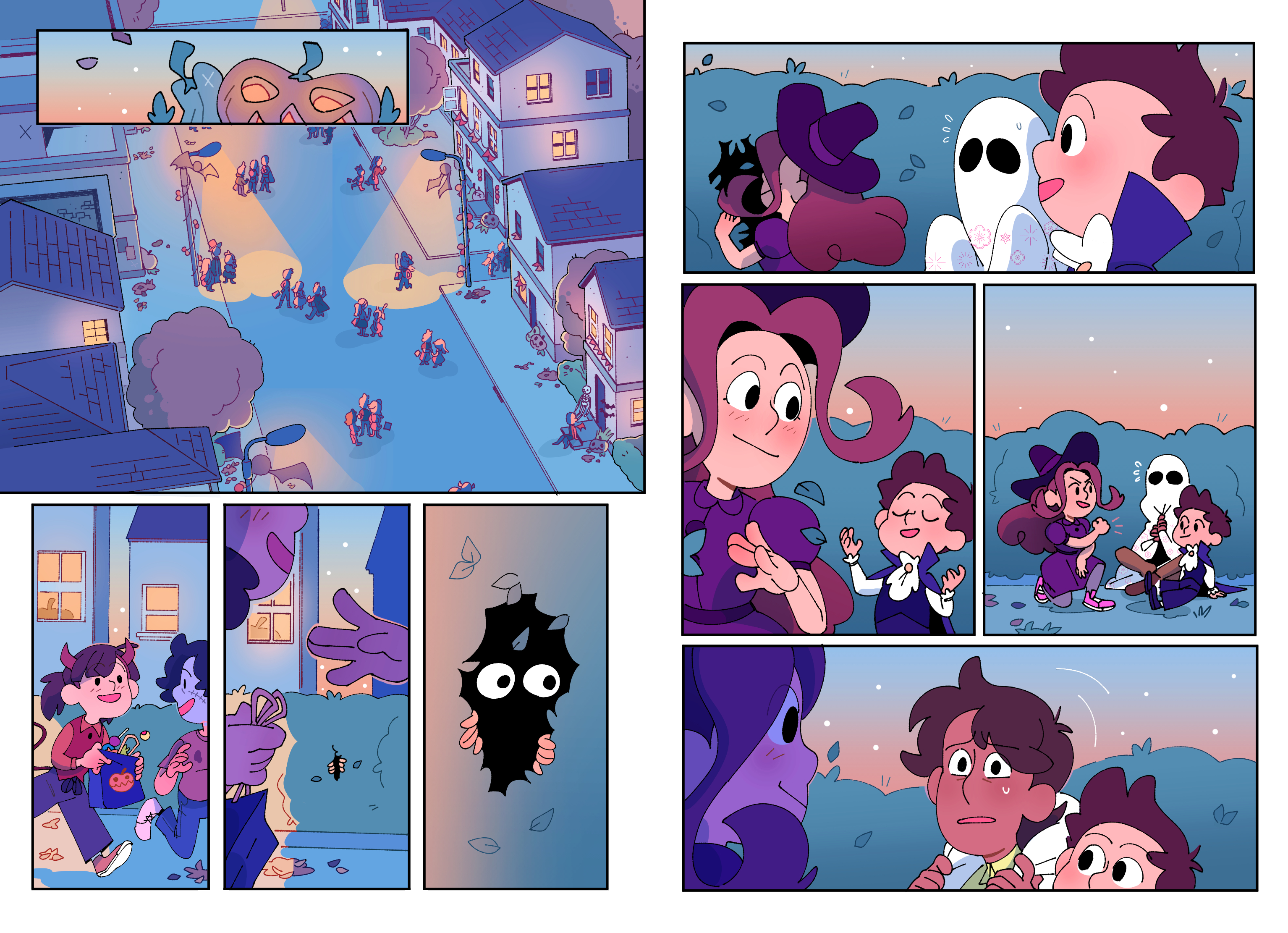 Character design and comic pages for my personal middle-grade comic book project about three kids who summon a powerful spirit on Halloween night (2024).